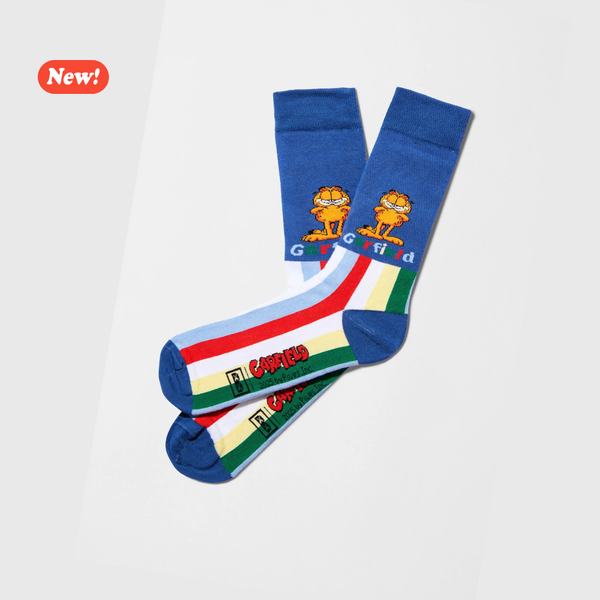 I calzini originali BeGarfield Stripes presentano un design a blocchi di colore, con la parte superiore blu e strisce orizzontali rosse, gialle, verdi e azzurre nella parte inferiore. Il personaggio di Garfield è intrecciato nella parte anteriore del risvolto su uno sfondo blu scuro. Il logo appare sulla suola e sotto il personaggio.