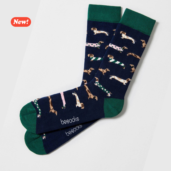 Gli originali calzini BePets Blue presentano una serie di bassotti illustrati in varie pose su uno sfondo blu scuro. I dettagli verdi su polsino, tallone e punta creano un contrasto visivo.