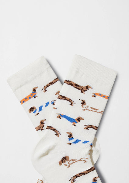 I calzini originali alla caviglia BePets Woman Off White presentano una fantasia all-over di bassotti in varie pose e colori su uno sfondo bianco sporco. Alcuni dei cani sono vestiti con abiti a pois e righe nei toni dell'arancione e del blu. Design a metà polpaccio con finiture coordinate.