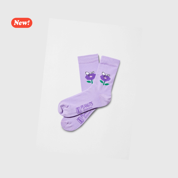 I calzini alla caviglia BeSnoopy Flower da donna presentano un design lilla con un motivo centrale raffigurante Snoopy adagiato su un grande fiore viola. Lo stile grafico fonde l'estetica delle classiche strisce dei Peanuts con un accenno alle attuali tendenze dello street style femminile.