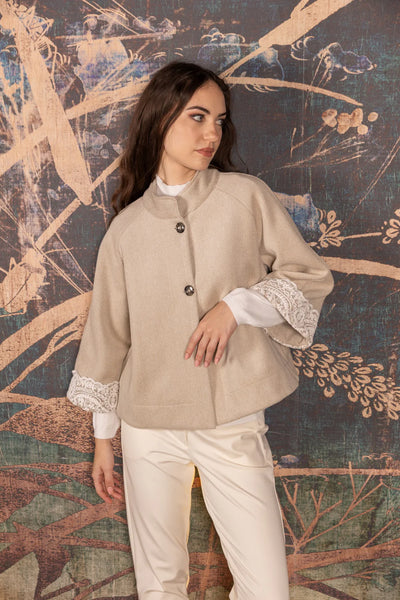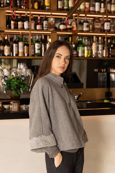 Eleva il tuo guardaroba con la nostra cappa Glamour, una giacca in stile kimono, elegantemente casual e caratterizzata da un dal nostro meraviglioso pizzo Corinzio applicato sulle maniche a tre quarti.