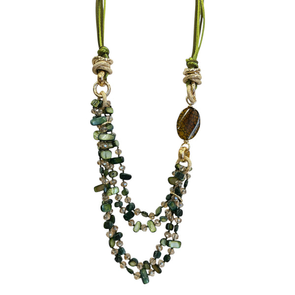 Collana lunga realizzata a mano con materiali naturali e di alta qualità. Composta da quattro fili di madreperla, una pietra dura naturale laterale e cordini scelti e abbinati al colore delle pietre. la collana è anallergica e inalterabile, un esempio di raffinato artigianato Made in Italy.