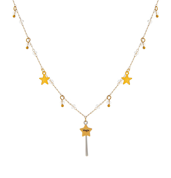Collana in acciaio dorato con bacchetta magica con incisa la parola “Magia” e cristalli.