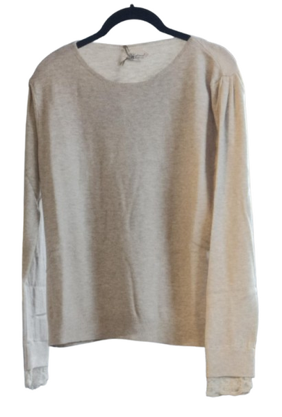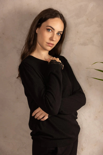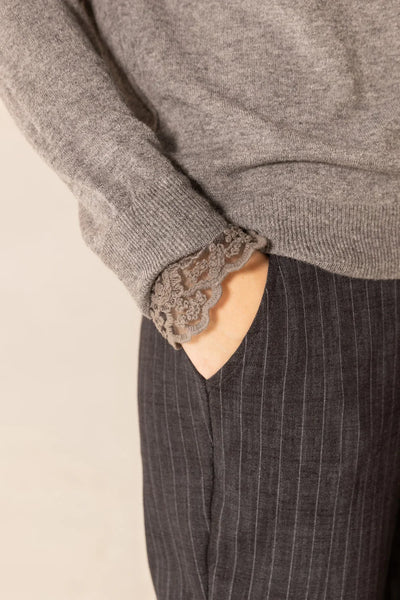 Impreziosito dal tocco glamour del nostro pizzo Corinzio applicato a polsino, il maglioncino Morris si identifica come capo must-have versatile e romantico all'unisono.