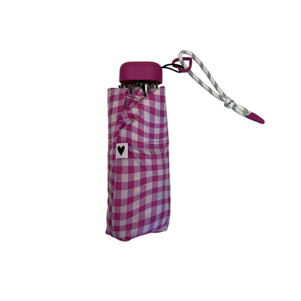 Ombrellino piatto Vichy, con custodia a tracolla, fatto in materiale riciclato, con sistema anti vento, tessuto protettivo anche dai raggi UV del sole. Con custodia della stessa fantasia a quadretti dell'ombrellino. Colorato, piccolo e pratico, perfetto da portare con te, da tenere in borsa o nello zaino.