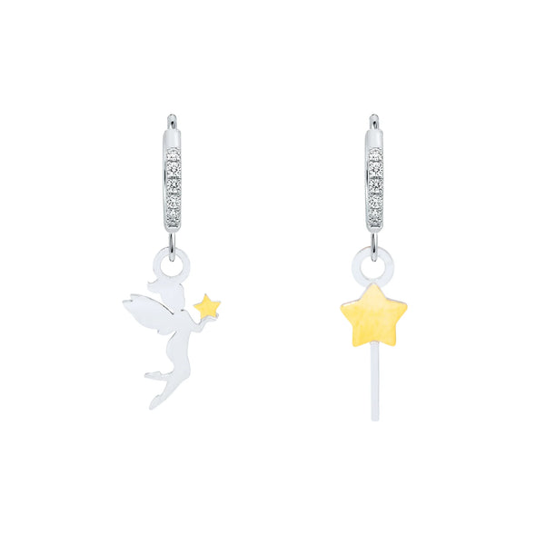 Orecchini a cerchio con cristalli e chiusura a scattino con piccola fata pendente e bacchetta magica.