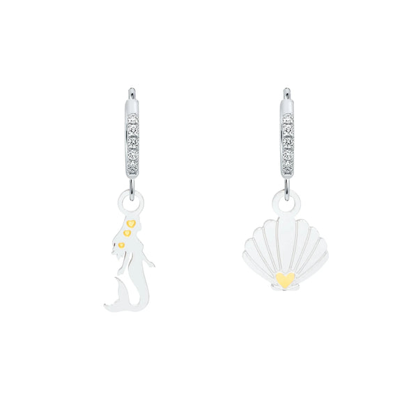 Orecchini a cerchio con cristalli con sirenetta e piccola conchiglia pendente. Chiusura a scattino.