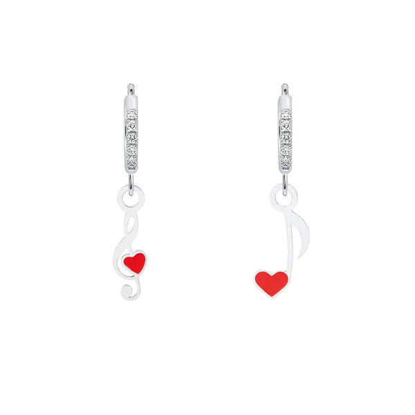 Orecchini a cerchio con cristalli con piccola nota musicale e chiave di violino caratterizzate da un piccolo cuore rosso al centro. Chiusura a scattino.