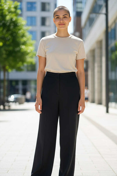 Pantaloni lunghi a gamba larga e vita alta. Chiusura con bottone centrale e cerniera. Abbinabili con diversi capi, con un bel gilet come quello col laccetto presente in negozio, oppure una camicia, una bella blusa, una giacca ecc. Per uno stile unico e super elegante