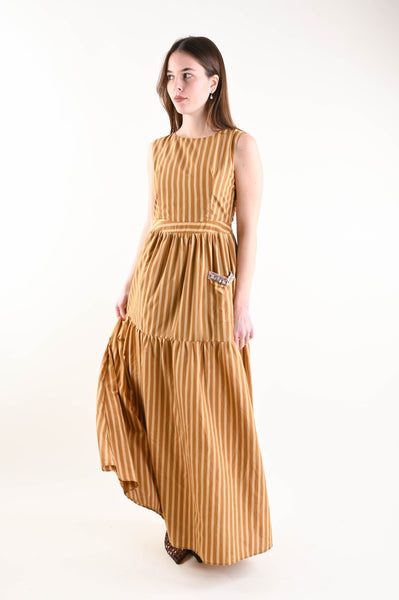 Abito lungo da donna con gonna ampia a balze e righe verticali che contribuiscono a slanciare la figura, conferendo un’eleganza dinamica e attuale. Dettaglio gioiello sulla tasca laterale e zip sul retro. Perfetto per i look quotidiani.