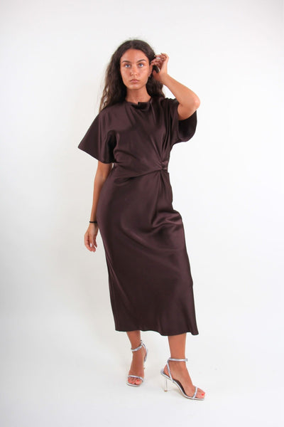 Abito midi dallo stile essenziale e moderno, realizzato in tessuto tecnico fluido con una vestibilità confortevole e impeccabile. Il dettaglio drappeggiato sul punto vita valorizza la silhouette con discrezione, aggiungendo un tocco di eleganza sartoriale. Le maniche corte e lo scollo pulito lo rendono perfetto per il giorno o per occasioni più formali. Un capo versatile e raffinato, ideale per la donna che cerca classe e semplicità in ogni dettaglio.