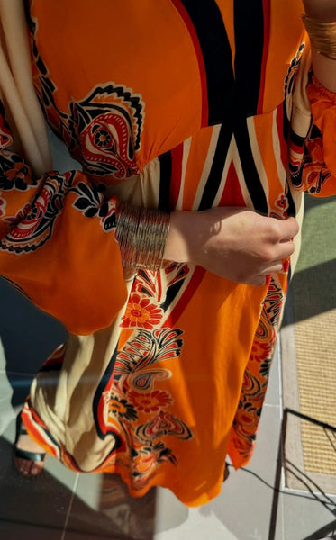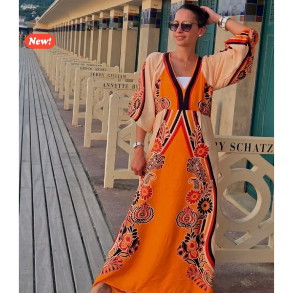 Abito fantasia con scollo a V e maniche a tre quarti, con chiusura posteriore. Bello, colorato e dallo stile esotico, perfetto per look primaverili ed estivi, dando luce alle vostre giornate, perfetto infatti per la sera ma anche per uscite giornaliere.