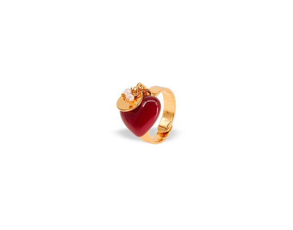 Anello con montatura regolabile, cuore in resina 10 mm e perline. Tocco romantico e creativo.