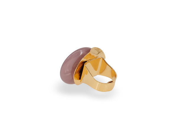 Anello regolabile con montatura in ottone e caratterizzato da un elemento centrale in resina, appoggiato su una piastra in ottone arricciata a mano.