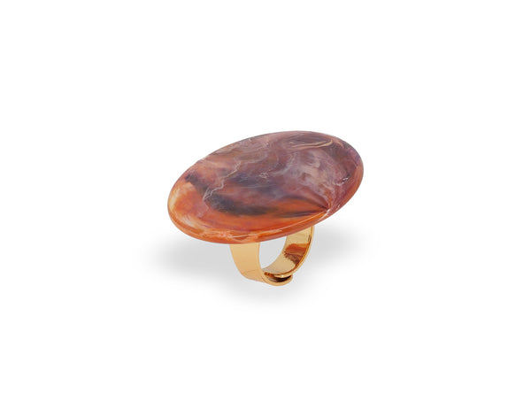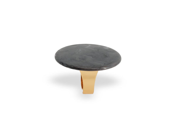Anello con parte superiore ovale in resina marmorizzata grigia. Montatura in ottone dorato regolabile. Finitura lucida, design moderno.