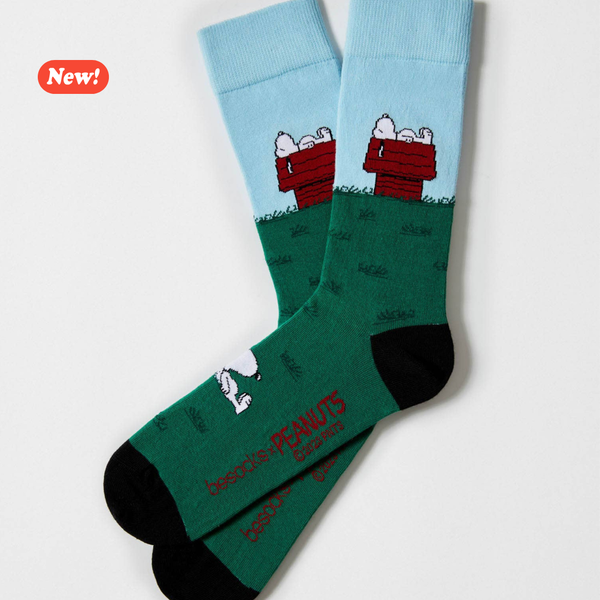 Gli originali calzini BeSnoopy House presentano la silhouette di Snoopy che spunta dalla sua cuccia rossa, su uno sfondo che sfuma dal verde all'azzurro cielo. La punta e il tallone neri offrono contrasto e maggiore resistenza.
