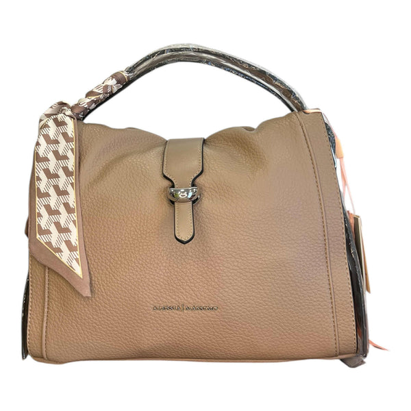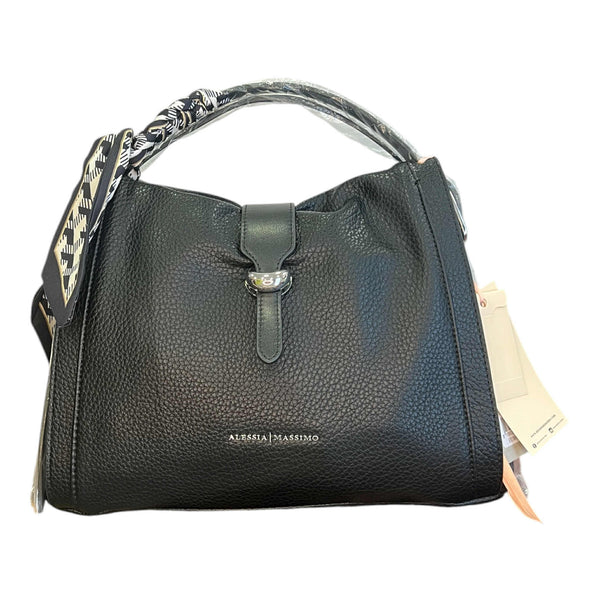 La borsa a mano STYLE1855 della collezione Autunno Inverno 2025-2026 di Alessia Massimo si veste di grigio antracite per un’eleganza sobria e trasversale. Il foulard annodato al manico e la chiusura con dettaglio decorativo aggiungono un tocco distintivo. Internamente organizzata e dotata di tracolla removibile, è una scelta raffinata per chi cerca stile e praticità nella vita quotidiana.