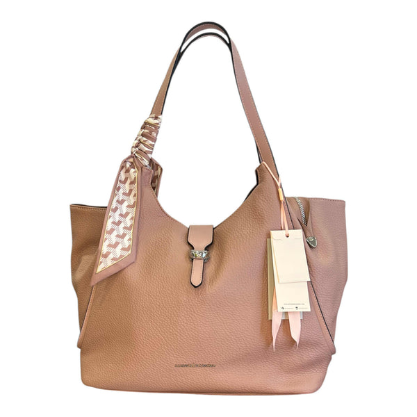 Realizzata in ecopelle rosa cipria, si distingue per il foulard annodato al manico e la chiusura elegante.