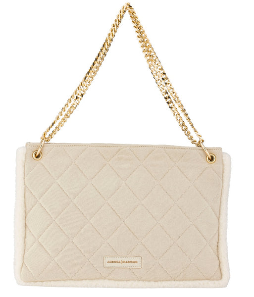Il tessuto trapuntato tono su tono si arricchisce con l’eleganza della doppia catena dorata, che la rende perfetta anche nelle occasioni serali.