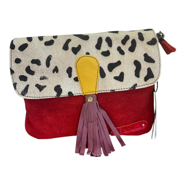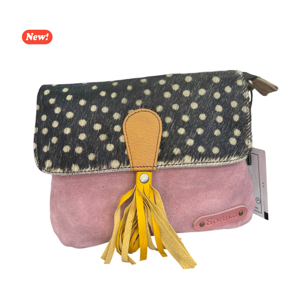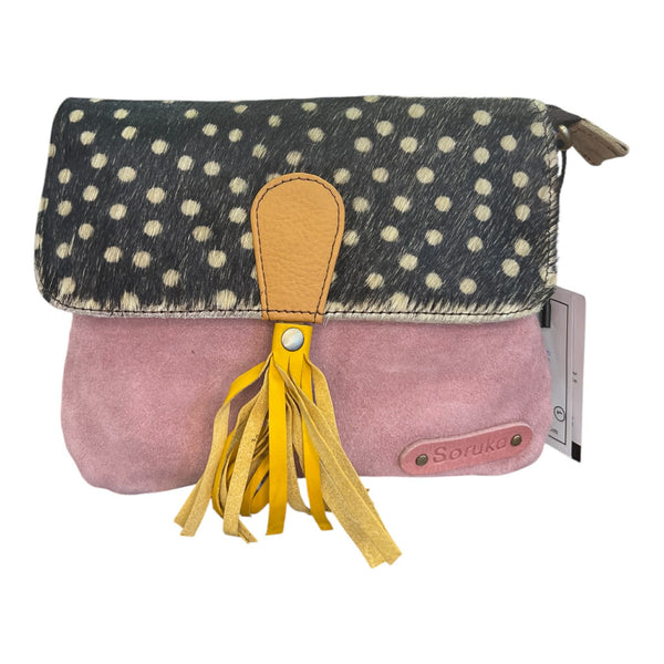Minibag scamosciata con chiusura a zip e magnete che presenta una taschina interna con zip. Dettaglio di animalier e nappa sulla patella. La borsa è corredata sia di cintura in pelle regolabile che di tracolla in pelle regolabile, così da poter essere portata come borsetta o come marsupio.