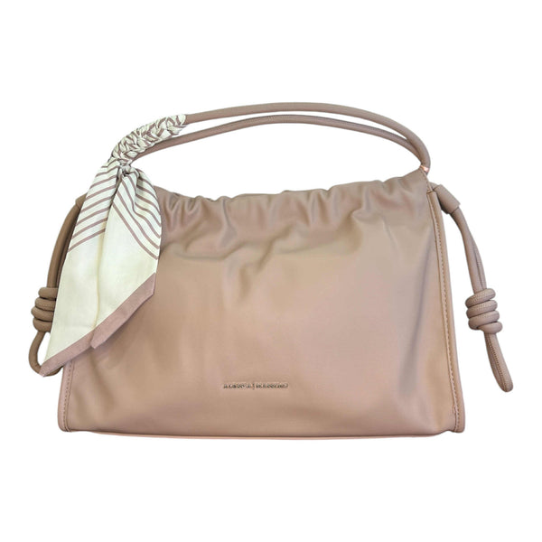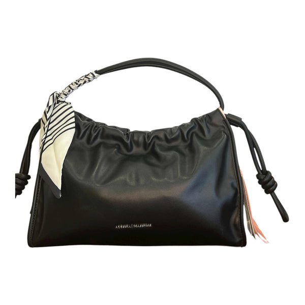 Borsa a mano in ecopelle morbida, di dimensioni medio piccole, con foulard attaccato e chiusura a sacco. Perfetta per look casual o più eleganti.