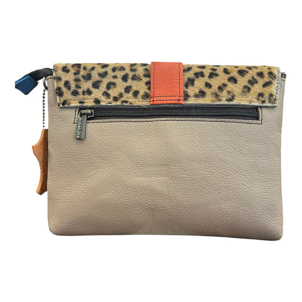 Borsa a busta, rettangolare e piatta, con chiusura a zip e bottone, con una zip interna e una zip sul retro della borsa.. Può essere portata a mano, a polso o con la tracolla in pelle regolabile.