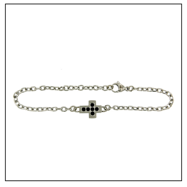 Bracciale uomo in acciaio, con croce ad elementi di color nero. Catenella piccola, un pezzo elegante e stiloso.