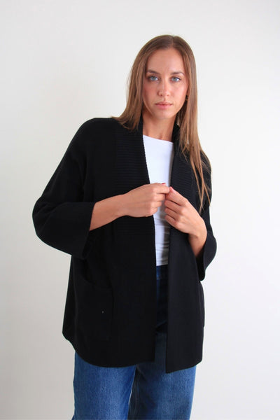 Cardigan aperto in filato morbido, dalla linea fluida e minimal, con collo a scialle lavorato a costine e comode tasche frontali.