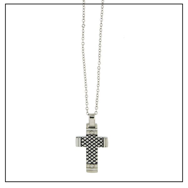 Collana in acciaio da uomo, con pendente a croce, quando il sacro si mischia al profano, allo stile moderno e attuale, con rispetto ed eleganza.