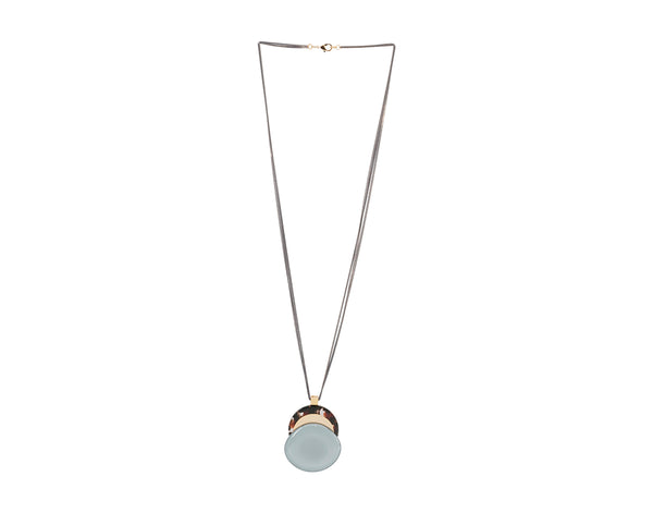 Collana lunga con pendente in resina e ottone e doppia catena in ottone a supporto. Chiusura con moschettone.