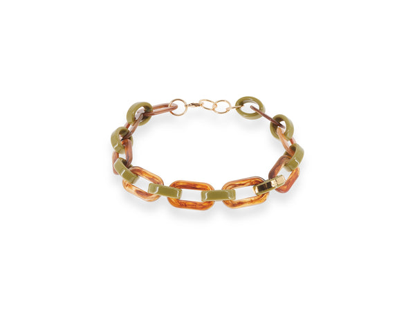 Girocollo con elementi in resina lucida e chiusura metallica in ottone. Stile deciso ma raffinato. Chiusura regolabile con moschettone.