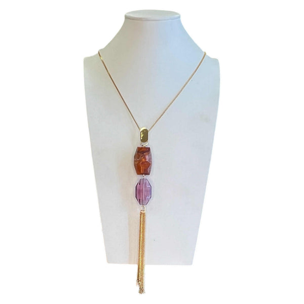 Collana lunga realizzata con catena cristallini. Il pendente centrale è composto da elementi geometrici in resina effetto marmo. Chiusura regolabile con moschettone. Completa il design una cascata pendente in catena di ottone con cristallini alla base.