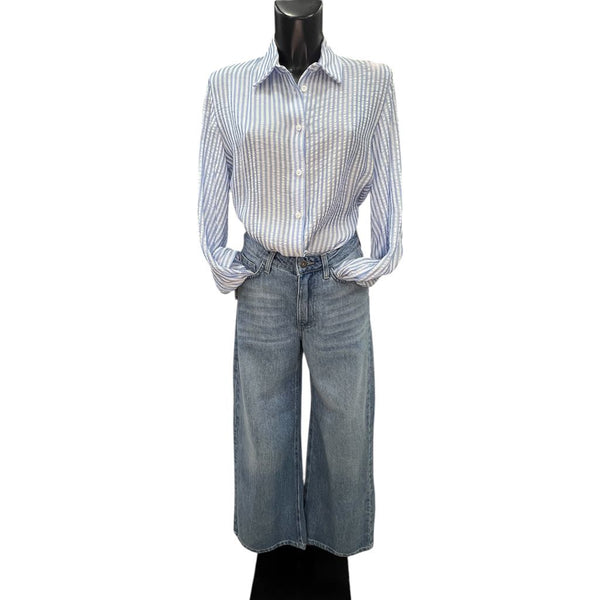 Jeans a zampa larga con tasche sul davanti e posteriori, morbidi e elasticizzati. Quasi totalmente in puro cotone per essere ancor più fresco e confortevole.
