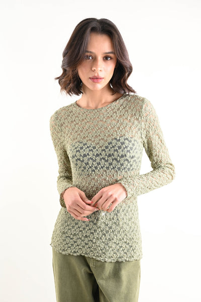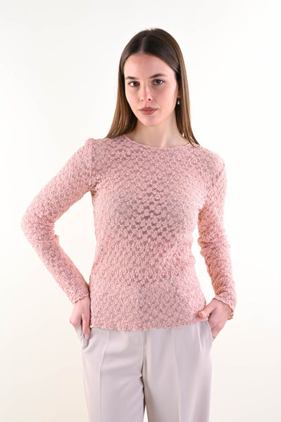 Maglia da donna realizzata in pizzo lavorato, presenta un girocollo semplice e una linea fluida e confortevole. La trama in pizzo crea un elegante effetto di trasparenze. Facile da indossare sotto giacche e t-shirt per un effetto più trendy.