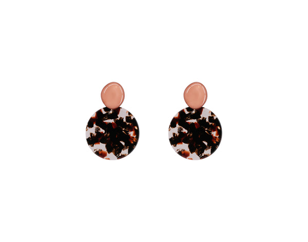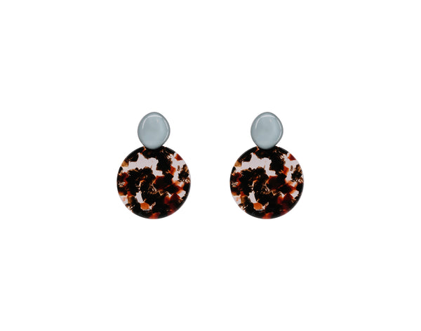 Orecchini pendenti in resina maculata con elementi a lobo in resina lucida.