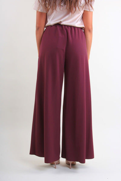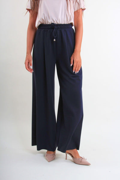 PantalonI donna ampi e fluidi, perfetti per garantire comfort e stile in ogni occasione. Il modello presenta una comoda vita elasticizzata con coulisse regolabile e una linea morbida che valorizza ogni silhouette, laccetti in tessuto tono su tono, impreziositi da finalini metallici lucidi.