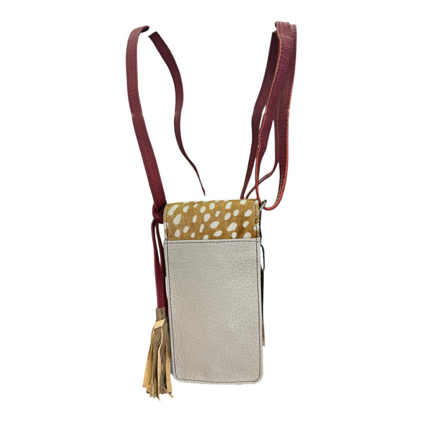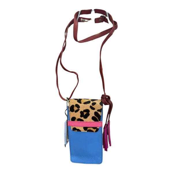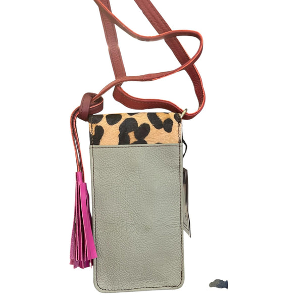 Portacellulare in pelle con stampa a pelo sulla patella. Il portacellulare si chiude a incastro della patella con una striscia di pelle. Presente anche una tracolla regolabile.