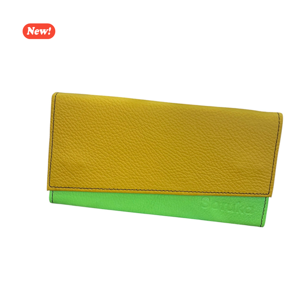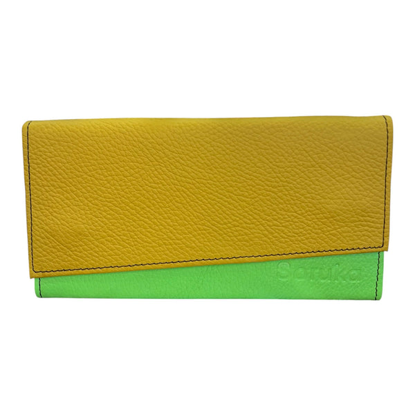 Portafoglio in pelle con 10 scomparti porta tessere, tasche per documenti e taschino portamonete esterno con zip. Chiusura a pattina di taglio diagonale con due bottoni magnetici.