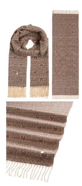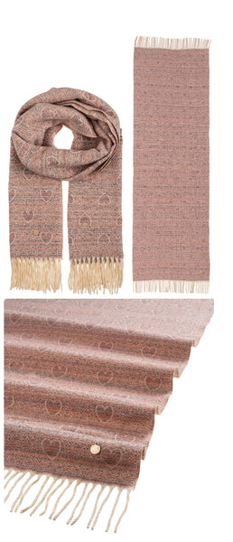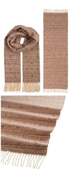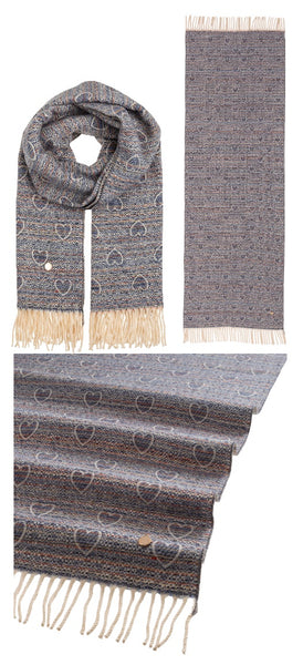 Sciarpa con cuori e frange alle estremità, una classica sciarpa rivisitata con una fantasia di cuori, peer le donne che sono eterne romantiche. Calda e morbida.