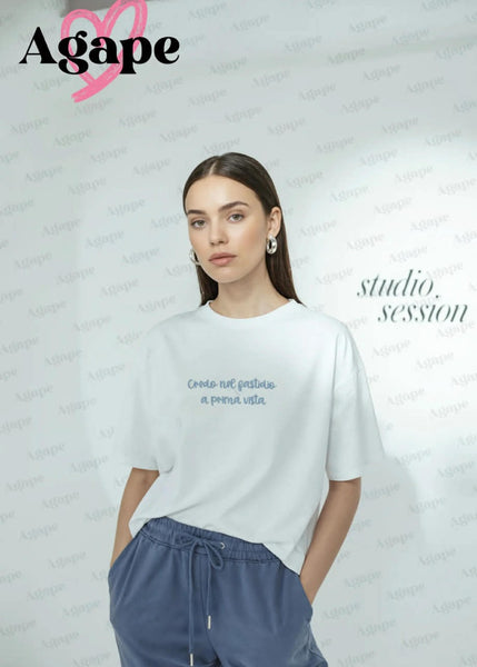 T-shirt donna "Credo nel fastidio a prima vista", fondo bianco con scritta colorata, fanno di questa t-shirt un capo semplice ma allo stesso tempo originale e stiloso. Perfetta per look casual giornalieri.