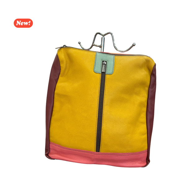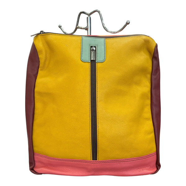 Zaino dalla forma quadrata in pelle liscia multicolore. Unico scomparto interno con taschina con zip e due tasche esterne con zip, una frontale e una più piccola posteriore. Spalline in pelle regolabili.